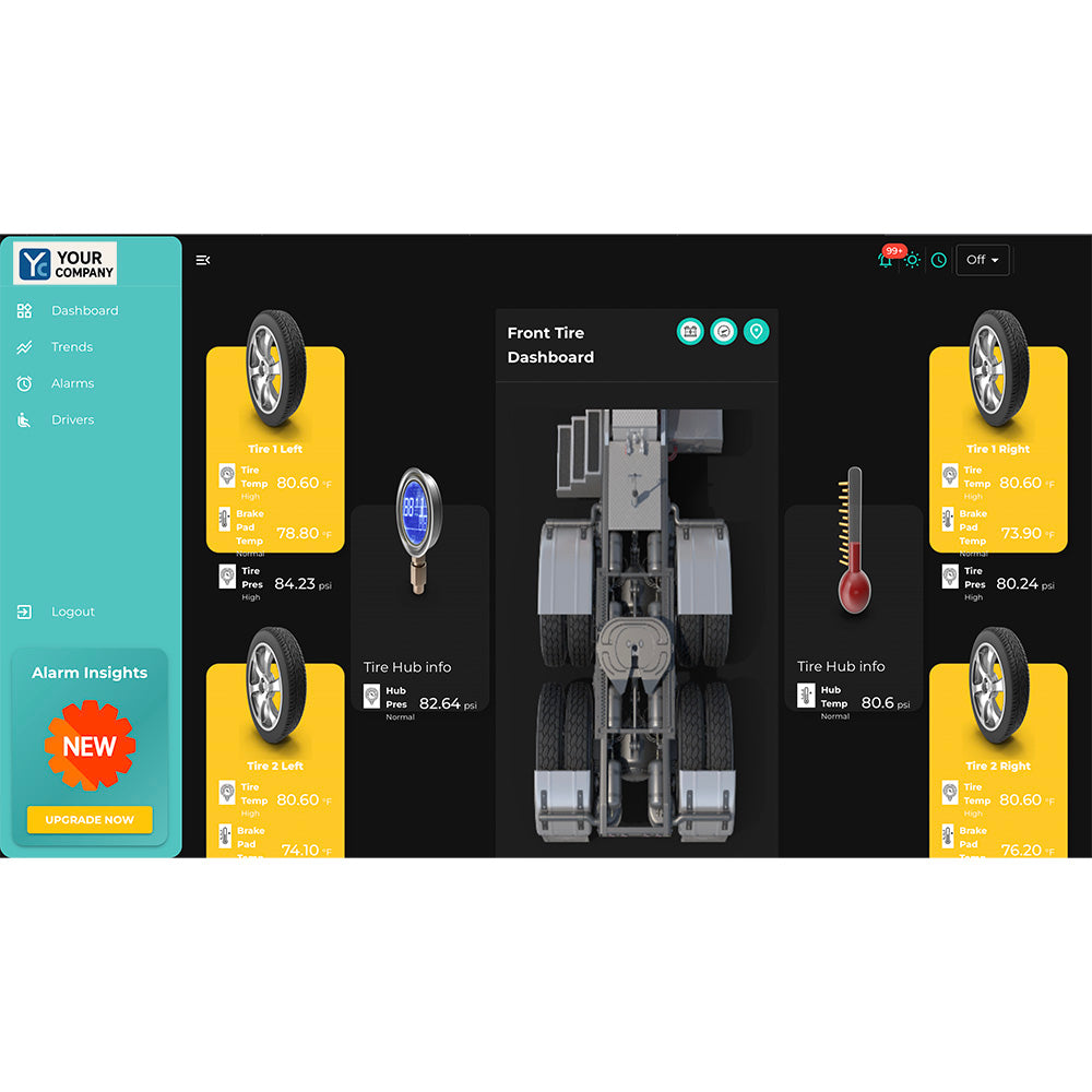 - monitor: brake temperature, tire pressure, tire temperature, tank fill, cameras and screenshots to verify fill level, or any custom metric upon request